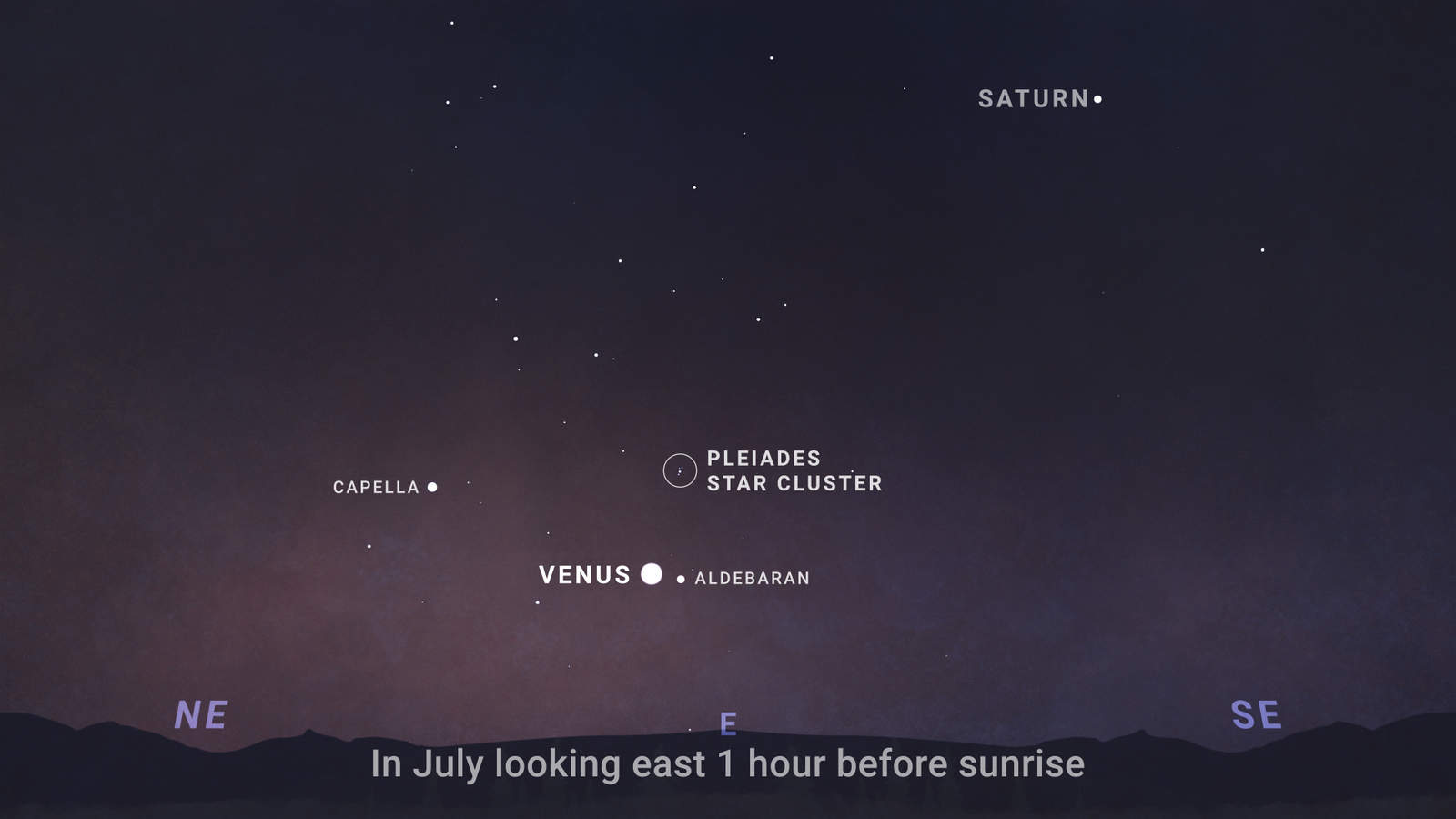 - Venus: Shines brightly in the east each morning during the couple of hours before sunrise, with the Pleiades and bright stars Aldebaran and Capella.