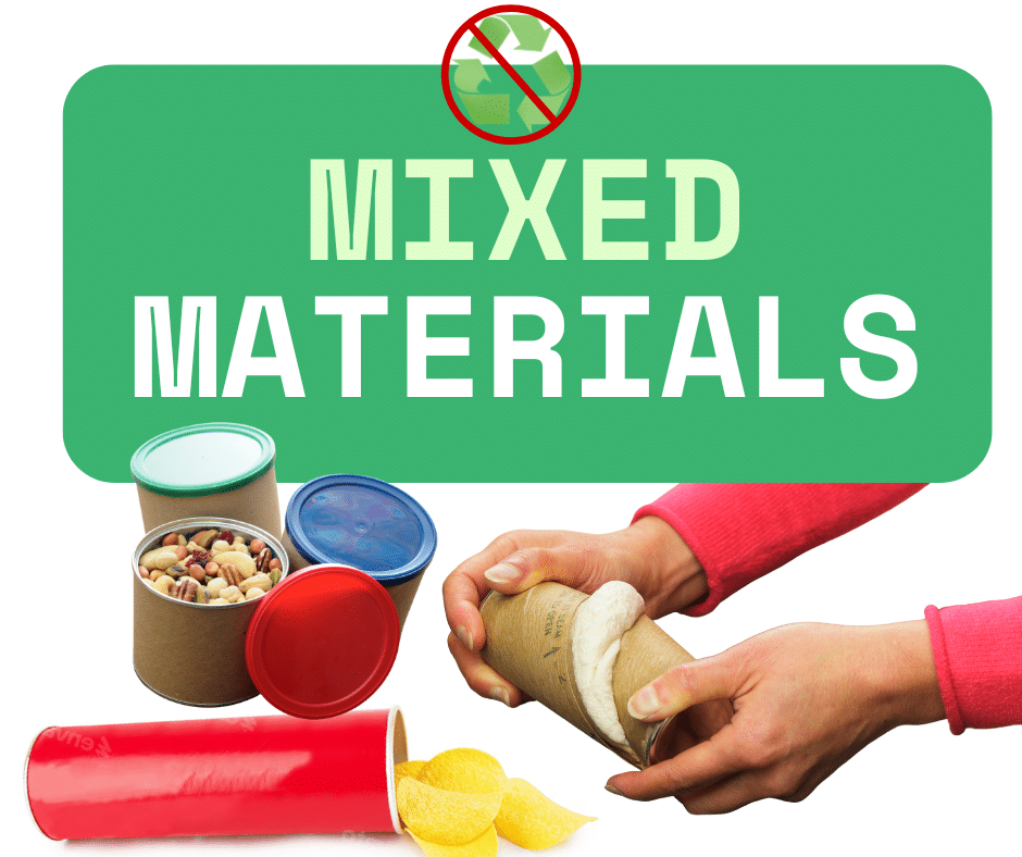 Mixed-material items combine different materials—like paper, plastic, and metal—into one product. While the materials might be recyclable on their own, when they’re fused together, they become nearly impossible to separate.