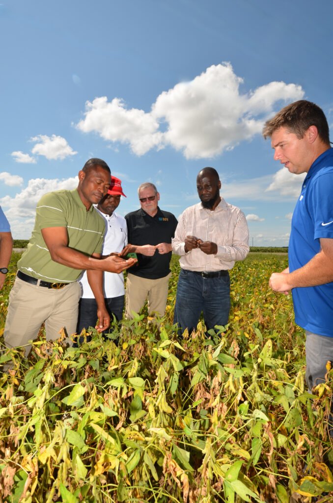 USB Executive Committee member Philip Good and his son, Christian, discuss their near-harvest-ready soybeans and quality grain management with WISHH’s trade team of Nigerian aquaculture feed manufacturers.
